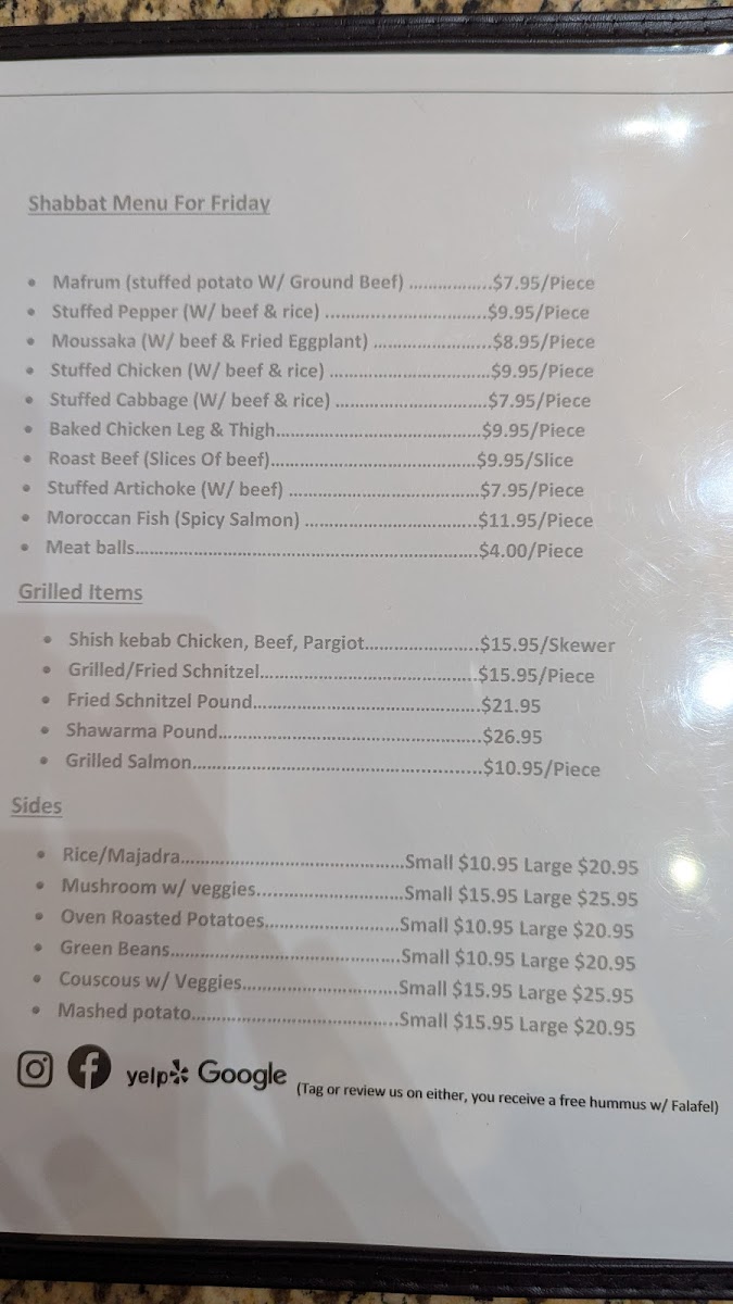 The menu showcases an impressive selection of both traditional and modern Middle Eastern offerings, each dish crafted with love and attention to detail. Start your culinary journey with the Tehina with Falafel Balls — a hearty portion of creamy tahini served with six perfectly fried falafel. The Hummus with Five Falafel Balls is another crowd-pleaser, featuring rich, velvety hummus complemented by the delightful crunch of falafel. For those seeking something crispy and savory, the 5 Moroccan Cigars served with tahini are a must-try. Each bite bursts with bold flavor, reminiscent of authentic Moroccan spices.