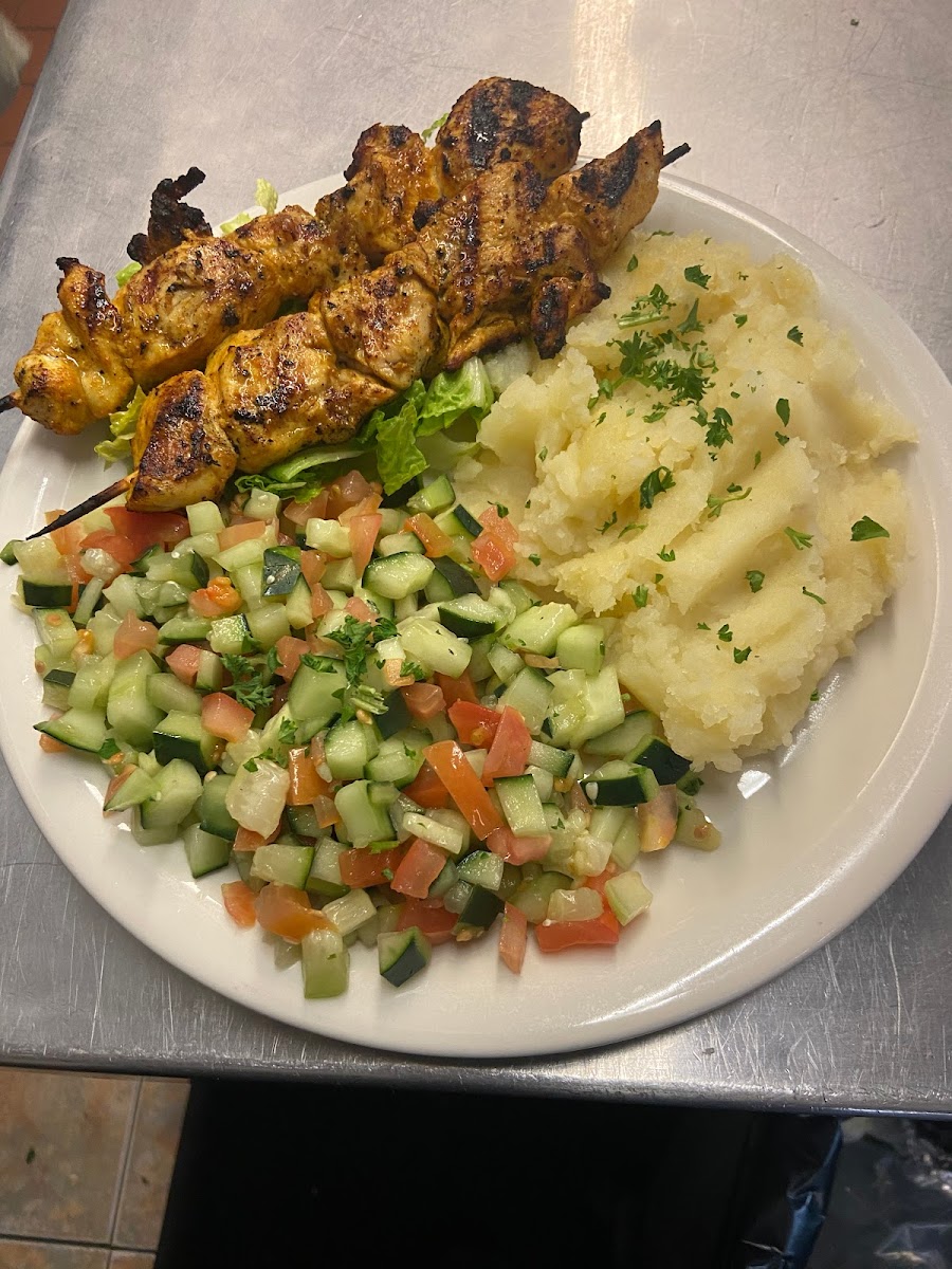 The main dishes are just as enticing, with a standout being the Shishkebab Chicken, where marinated chicken breast is grilled to juicy perfection and served with your choice of two sides. Each skewer offers smoky, tender meat that dances on your palate. Vegetarian options abound as well, such as the delightful Stuffed Chicken — a beautifully seasoned dish filled with seasoned rice and ground beef that comforts the soul.